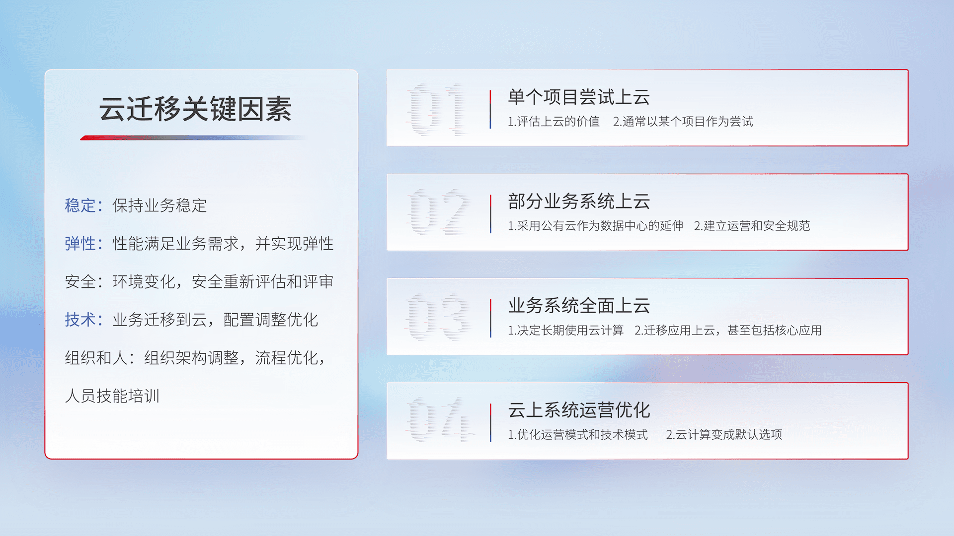结合实际业务,,从规划设计、、云平台选型、、云原生改造、、数据迁移、、集成交付,,迁移全过程为客户识别最佳上云路径,,做好风险识别管理,,设计网络架构、、、、身份权限、、安全审计合规、、、操作审计、、、、日志审计、、、、监控告警策略、、多站点容灾设计等,,,对云上基础设施进行整体规划,,,,提升IT治理水平,,,,以满足弹性、、高可用、、、高性能的需求。。。