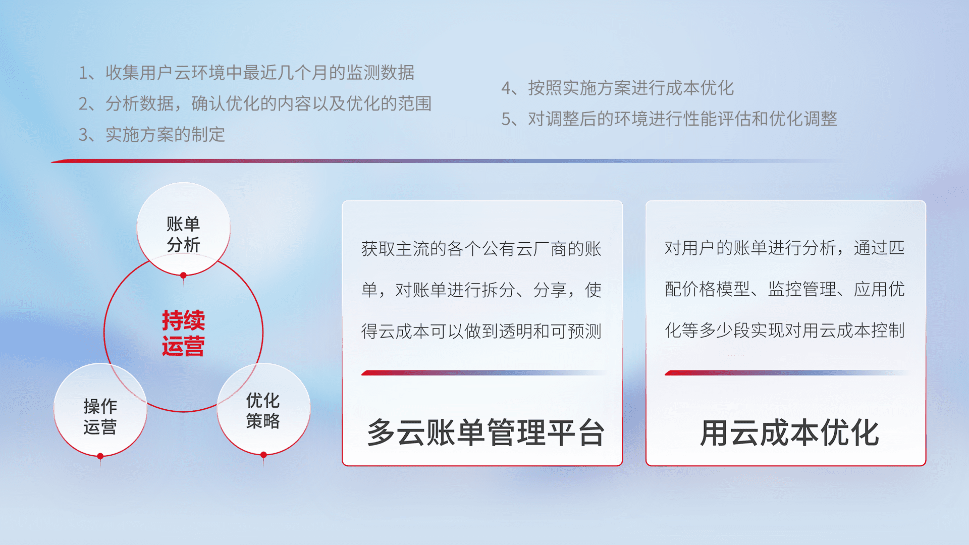 通过多云纳管,,以统一的资源数据模型把客户的云资源进行抽象和封装,,,进而实现对多云资源的统一操作,,,保障云资源管理的可靠性、、、、稳定性与可用性。。。量身定制化运维内容,,,配置、、、开发运维、、、、补丁管理、、、、备份、、、、监控、、认证和访问管理、、、、审计和日常巡检等,,保障在用云过程中的可靠度,,稳定度以及高可用率。。。。